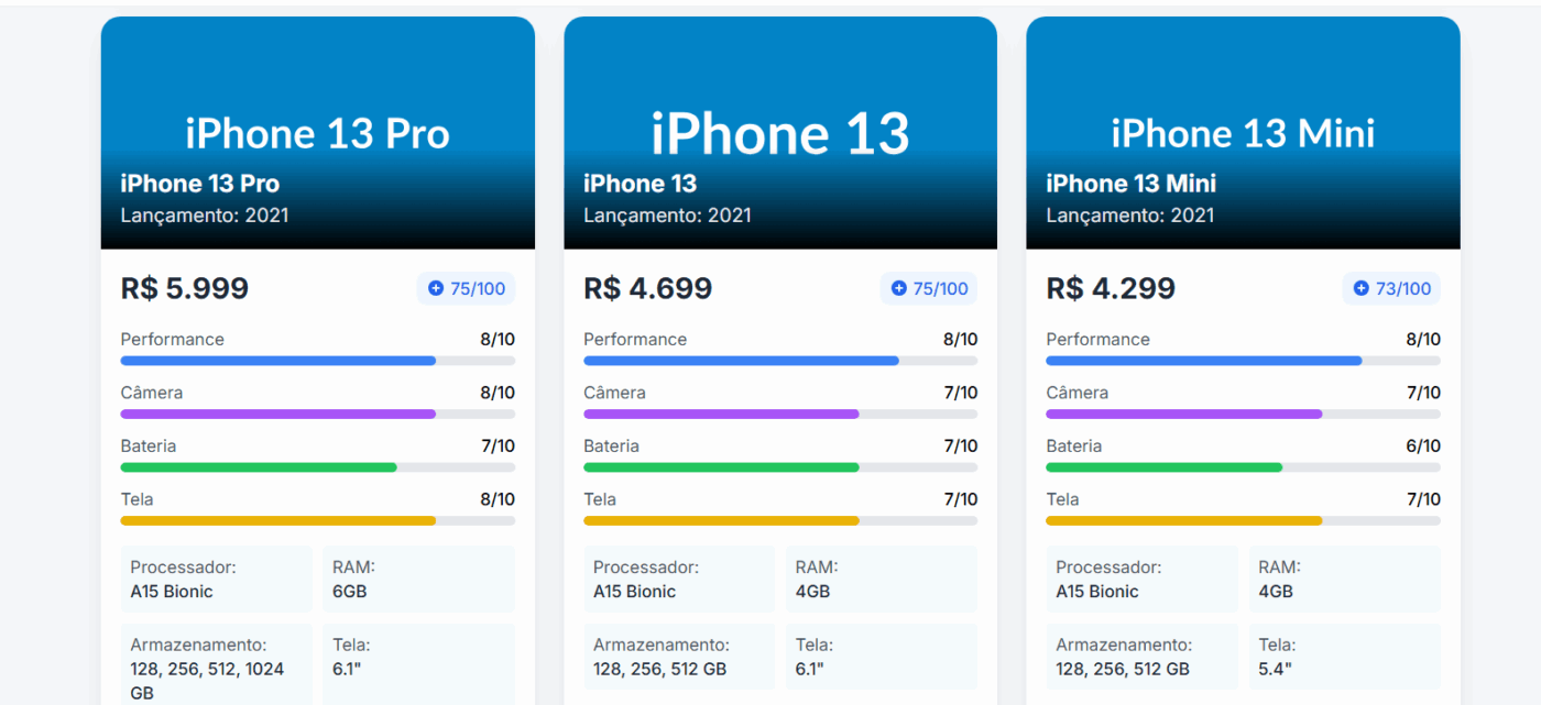 - Compare os modelos: Veja desde iPhones mais simples até os últimos lançamentos lado a lado.