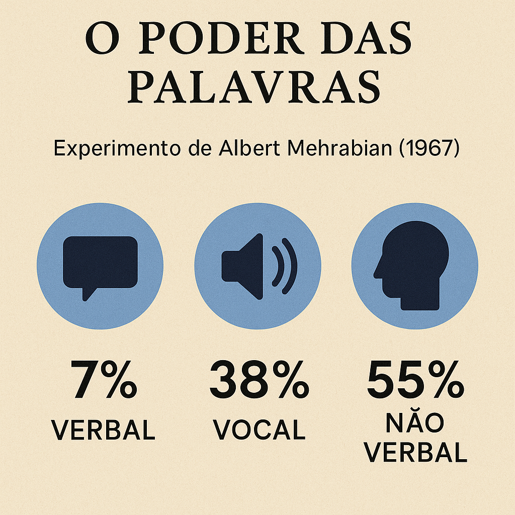 Mehrabian, psicólogo da UCLA, conduziu estudos para entender a comunicação interpessoal. Ele demonstrou que, quando há incongruência entre palavras, tom de voz e expressões faciais, as pessoas tendem a acreditar mais na forma como algo é dito do que no conteúdo em si. O famoso “princípio 7-38-55” sugere que: